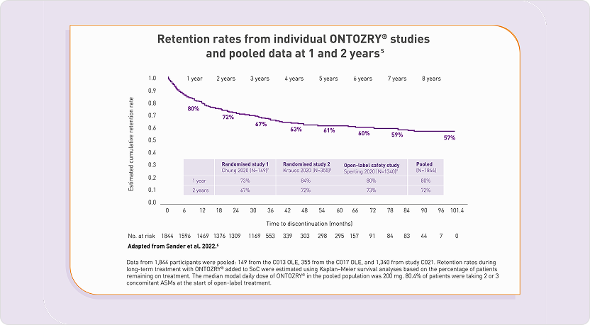 Retention rates on ONTOZRY® appear to be comparable to or better than rates reported for ASMs in pre-marketing open-label extension studies conducted as part of respective clinical development programmes.5
