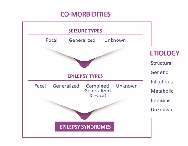 Classification of epilepsy is made according to seizure type, epilepsy type, and syndrome (Scheffer et al., 2017). The causes are divided into genetic, structural, metabolic, infectious, immune, and unknown, while seizures are first classified by onset as either focal, generalized, or unknown.